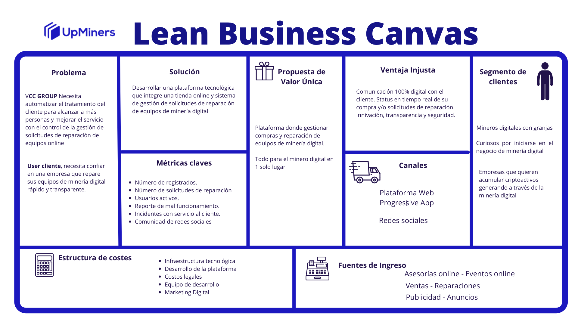Luego de las reuniones de brainstorming, hicimos la propuesta de trabajo para VCC GROUP presentando los Canvas de Modelado de Negocio
